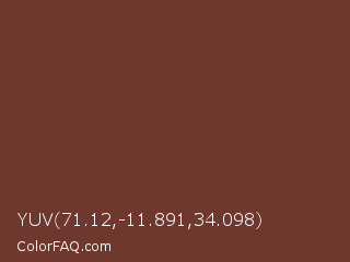 YUV 71.12,-11.891,34.098 Color is a normal red color and the nearest color is Wine #722f37. Hex code #6e382f and RGB value is rgb(110,56,47). In RGB color space, this color is composed of 43% red, 22% green, 18% blue, In CMYK color space, this color is composed of 0% cyan, 49% magenta, 57% yellow , 57% black , In HSL color space, this color has a hue angle of 9° , 40% saturation and 31% lightness.