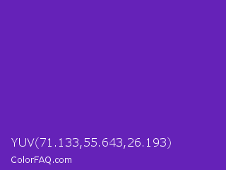 YUV 71.133,55.643,26.193 Color is a normal violet color and the nearest color is Purple Heart Crayola #652dc1. Hex code #6522b8 and RGB value is rgb(101,34,184). In RGB color space, this color is composed of 40% red, 13% green, 72% blue, In CMYK color space, this color is composed of 45% cyan, 82% magenta, 0% yellow , 28% black , In HSL color space, this color has a hue angle of 267° , 69% saturation and 43% lightness.