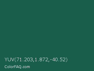 YUV 71.203,1.872,-40.52 Color is a dark green color and the nearest color is Green Pea #1d6142. Hex code #195e4b and RGB value is rgb(25,94,75). In RGB color space, this color is composed of 10% red, 37% green, 29% blue, In CMYK color space, this color is composed of 73% cyan, 0% magenta, 20% yellow , 63% black , In HSL color space, this color has a hue angle of 163° , 58% saturation and 23% lightness.