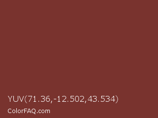 YUV 71.36,-12.502,43.534 Color is a normal red color and the nearest color is Wine #722f37. Hex code #79332e and RGB value is rgb(121,51,46). In RGB color space, this color is composed of 47% red, 20% green, 18% blue, In CMYK color space, this color is composed of 0% cyan, 58% magenta, 62% yellow , 53% black , In HSL color space, this color has a hue angle of 4° , 45% saturation and 33% lightness.