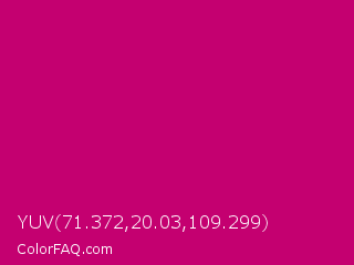 YUV 71.372,20.03,109.299 Color is a normal magenta color and the nearest color is Lipstick #ab0563. Hex code #c40070 and RGB value is rgb(196,-0,112). In RGB color space, this color is composed of 77% red, 0% green, 44% blue, In CMYK color space, this color is composed of 0% cyan, 100% magenta, 43% yellow , 23% black , In HSL color space, this color has a hue angle of 326° , 100% saturation and 38% lightness.