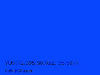 YUV 71.395,88.052,-55.597 Color is a normal blue color and the nearest color is Blue RYB #0247fe. Hex code #0845fa and RGB value is rgb(8,69,250). In RGB color space, this color is composed of 3% red, 27% green, 98% blue, In CMYK color space, this color is composed of 97% cyan, 72% magenta, 0% yellow , 2% black , In HSL color space, this color has a hue angle of 225° , 96% saturation and 51% lightness.