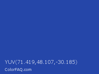 YUV 71.419,48.107,-30.185 Color is a normal blue color and the nearest color is Denim Blue #2243b6. Hex code #2546a9 and RGB value is rgb(37,70,169). In RGB color space, this color is composed of 15% red, 27% green, 66% blue, In CMYK color space, this color is composed of 78% cyan, 59% magenta, 0% yellow , 34% black , In HSL color space, this color has a hue angle of 225° , 64% saturation and 40% lightness.