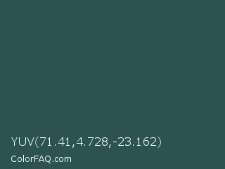 YUV 71.41,4.728,-23.162 Color is a dark cyan color and the nearest color is Dark Slate Gray #2f4f4f. Hex code #2d5351 and RGB value is rgb(45,83,81). In RGB color space, this color is composed of 18% red, 33% green, 32% blue, In CMYK color space, this color is composed of 46% cyan, 0% magenta, 2% yellow , 67% black , In HSL color space, this color has a hue angle of 177° , 30% saturation and 25% lightness.