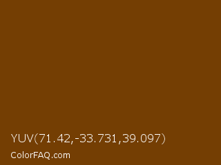 YUV 71.42,-33.731,39.097 Color is a dark orange color and the nearest color is Cinnamon #7b3f00. Hex code #743e03 and RGB value is rgb(116,62,3). In RGB color space, this color is composed of 45% red, 24% green, 1% blue, In CMYK color space, this color is composed of 0% cyan, 47% magenta, 97% yellow , 55% black , In HSL color space, this color has a hue angle of 31° , 95% saturation and 23% lightness.