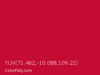 YUV 71.462,-10.088,109.22 Color is a normal red color and the nearest color is Red NCS #c40233. Hex code #c40c33 and RGB value is rgb(196,12,51). In RGB color space, this color is composed of 77% red, 5% green, 20% blue, In CMYK color space, this color is composed of 0% cyan, 94% magenta, 74% yellow , 23% black , In HSL color space, this color has a hue angle of 347° , 88% saturation and 41% lightness.