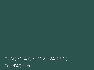 YUV 71.47,3.712,-24.091 Color is a dark cyan color and the nearest color is Dark Slate Gray #2f4f4f. Hex code #2c544f and RGB value is rgb(44,84,79). In RGB color space, this color is composed of 17% red, 33% green, 31% blue, In CMYK color space, this color is composed of 48% cyan, 0% magenta, 6% yellow , 67% black , In HSL color space, this color has a hue angle of 173° , 31% saturation and 25% lightness.