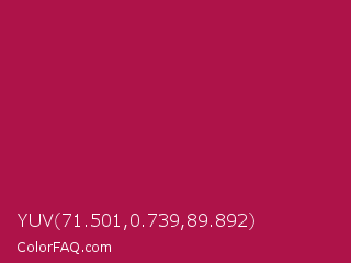 YUV 71.501,0.739,89.892 Color is a normal rose color and the nearest color is French Wine #ac1e44. Hex code #ae1349 and RGB value is rgb(174,19,73). In RGB color space, this color is composed of 68% red, 7% green, 29% blue, In CMYK color space, this color is composed of 0% cyan, 89% magenta, 58% yellow , 32% black , In HSL color space, this color has a hue angle of 339° , 80% saturation and 38% lightness.