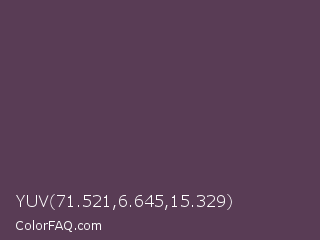 YUV 71.521,6.645,15.329 Color is a dark magenta color and the nearest color is Dark Byzantium #5d3954. Hex code #593c55 and RGB value is rgb(89,60,85). In RGB color space, this color is composed of 35% red, 24% green, 33% blue, In CMYK color space, this color is composed of 0% cyan, 33% magenta, 4% yellow , 65% black , In HSL color space, this color has a hue angle of 308° , 19% saturation and 29% lightness.