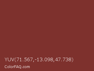 YUV 71.567,-13.098,47.738 Color is a normal red color and the nearest color is Red Robin #80341f. Hex code #7e312d and RGB value is rgb(126,49,45). In RGB color space, this color is composed of 49% red, 19% green, 18% blue, In CMYK color space, this color is composed of 0% cyan, 61% magenta, 64% yellow , 51% black , In HSL color space, this color has a hue angle of 3° , 47% saturation and 34% lightness.