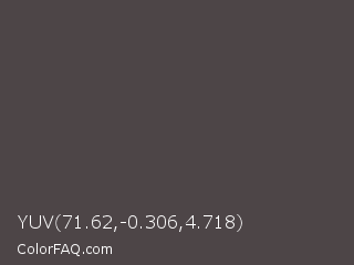 YUV 71.62,-0.306,4.718 Color is a dark red color and the nearest color is Emperor #514649. Hex code #4d4547 and RGB value is rgb(77,69,71). In RGB color space, this color is composed of 30% red, 27% green, 28% blue, In CMYK color space, this color is composed of 0% cyan, 10% magenta, 8% yellow , 70% black , In HSL color space, this color has a hue angle of 345° , 5% saturation and 29% lightness.