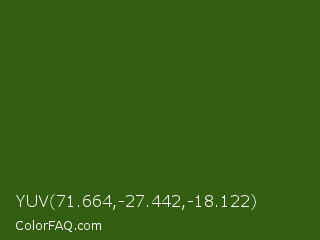 YUV 71.664,-27.442,-18.122 Color is a very dark green color and the nearest color is Dell #396413. Hex code #335d10 and RGB value is rgb(51,93,16). In RGB color space, this color is composed of 20% red, 36% green, 6% blue, In CMYK color space, this color is composed of 45% cyan, 0% magenta, 83% yellow , 64% black , In HSL color space, this color has a hue angle of 93° , 71% saturation and 21% lightness.