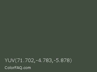 YUV 71.702,-4.783,-5.878 Color is a dark green color and the nearest color is Cabbage Pont #3f4c3a. Hex code #414d3e and RGB value is rgb(65,77,62). In RGB color space, this color is composed of 25% red, 30% green, 24% blue, In CMYK color space, this color is composed of 16% cyan, 0% magenta, 19% yellow , 70% black , In HSL color space, this color has a hue angle of 108° , 11% saturation and 27% lightness.