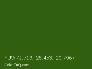 YUV 71.713,-28.453,-20.796 Color is a very dark green color and the nearest color is Dell #396413. Hex code #305f0e and RGB value is rgb(48,95,14). In RGB color space, this color is composed of 19% red, 37% green, 5% blue, In CMYK color space, this color is composed of 49% cyan, 0% magenta, 85% yellow , 63% black , In HSL color space, this color has a hue angle of 95° , 74% saturation and 21% lightness.