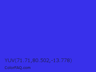YUV 71.71,80.502,-13.778 Color is a normal indigo color and the nearest color is Palatinate Blue #273be2. Hex code #3830eb and RGB value is rgb(56,48,235). In RGB color space, this color is composed of 22% red, 19% green, 92% blue, In CMYK color space, this color is composed of 76% cyan, 80% magenta, 0% yellow , 8% black , In HSL color space, this color has a hue angle of 243° , 82% saturation and 55% lightness.