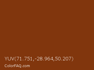 YUV 71.751,-28.964,50.207 Color is a dark orange color and the nearest color is Copper Canyon #7e3a15. Hex code #81360d and RGB value is rgb(129,54,13). In RGB color space, this color is composed of 51% red, 21% green, 5% blue, In CMYK color space, this color is composed of 0% cyan, 58% magenta, 90% yellow , 49% black , In HSL color space, this color has a hue angle of 21° , 82% saturation and 28% lightness.