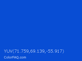 YUV 71.759,69.139,-55.917 Color is a normal blue color and the nearest color is Sapphire #0f52ba. Hex code #084dd4 and RGB value is rgb(8,77,212). In RGB color space, this color is composed of 3% red, 30% green, 83% blue, In CMYK color space, this color is composed of 96% cyan, 64% magenta, 0% yellow , 17% black , In HSL color space, this color has a hue angle of 220° , 93% saturation and 43% lightness.