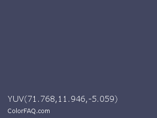 YUV 71.768,11.946,-5.059 Color is a normal blue color and the nearest color is River Bed #434c59. Hex code #424660 and RGB value is rgb(66,70,96). In RGB color space, this color is composed of 26% red, 27% green, 38% blue, In CMYK color space, this color is composed of 31% cyan, 27% magenta, 0% yellow , 62% black , In HSL color space, this color has a hue angle of 232° , 19% saturation and 32% lightness.