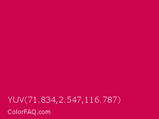 YUV 71.834,2.547,116.787 Color is a normal rose color and the nearest color is Spanish Carmine #d10047. Hex code #cd034d and RGB value is rgb(205,3,77). In RGB color space, this color is composed of 80% red, 1% green, 30% blue, In CMYK color space, this color is composed of 0% cyan, 99% magenta, 62% yellow , 20% black , In HSL color space, this color has a hue angle of 338° , 97% saturation and 41% lightness.