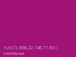 YUV 71.858,22.748,77.301 Color is a normal magenta color and the nearest color is Flirt #a2006d. Hex code #a01276 and RGB value is rgb(160,18,118). In RGB color space, this color is composed of 63% red, 7% green, 46% blue, In CMYK color space, this color is composed of 0% cyan, 89% magenta, 26% yellow , 37% black , In HSL color space, this color has a hue angle of 318° , 80% saturation and 35% lightness.
