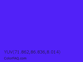 YUV 71.862,86.836,8.014 Color is a normal indigo color and the nearest color is Han Purple #5218fa. Hex code #5121f8 and RGB value is rgb(81,33,248). In RGB color space, this color is composed of 32% red, 13% green, 97% blue, In CMYK color space, this color is composed of 67% cyan, 87% magenta, 0% yellow , 3% black , In HSL color space, this color has a hue angle of 253° , 94% saturation and 55% lightness.