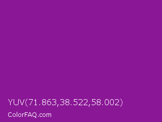 YUV 71.863,38.522,58.002 Color is a normal magenta color and the nearest color is Violet Eggplant #991199. Hex code #8a1796 and RGB value is rgb(138,23,150). In RGB color space, this color is composed of 54% red, 9% green, 59% blue, In CMYK color space, this color is composed of 8% cyan, 85% magenta, 0% yellow , 41% black , In HSL color space, this color has a hue angle of 294° , 73% saturation and 34% lightness.
