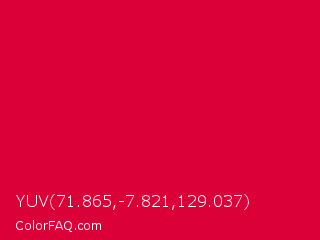 YUV 71.865,-7.821,129.037 Color is a normal red color and the nearest color is Rich Carmine #d70040. Hex code #db0038 and RGB value is rgb(219,-0,56). In RGB color space, this color is composed of 86% red, 0% green, 22% blue, In CMYK color space, this color is composed of 0% cyan, 100% magenta, 74% yellow , 14% black , In HSL color space, this color has a hue angle of 345° , 100% saturation and 43% lightness.