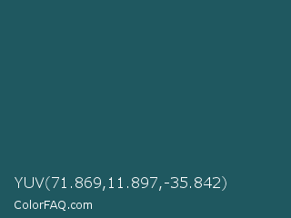 YUV 71.869,11.897,-35.842 Color is a dark cyan color and the nearest color is Spectra #2f5a57. Hex code #1f5860 and RGB value is rgb(31,88,96). In RGB color space, this color is composed of 12% red, 35% green, 38% blue, In CMYK color space, this color is composed of 68% cyan, 8% magenta, 0% yellow , 62% black , In HSL color space, this color has a hue angle of 187° , 51% saturation and 25% lightness.