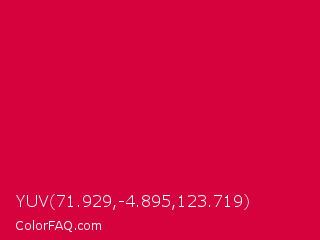YUV 71.929,-4.895,123.719 Color is a normal rose color and the nearest color is Utah Crimson #d3003f. Hex code #d5023e and RGB value is rgb(213,2,62). In RGB color space, this color is composed of 84% red, 1% green, 24% blue, In CMYK color space, this color is composed of 0% cyan, 99% magenta, 71% yellow , 16% black , In HSL color space, this color has a hue angle of 343° , 98% saturation and 42% lightness.