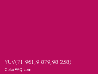 YUV 71.961,9.879,98.258 Color is a normal rose color and the nearest color is Lipstick #ab0563. Hex code #b80b5c and RGB value is rgb(184,11,92). In RGB color space, this color is composed of 72% red, 4% green, 36% blue, In CMYK color space, this color is composed of 0% cyan, 94% magenta, 50% yellow , 28% black , In HSL color space, this color has a hue angle of 332° , 89% saturation and 38% lightness.