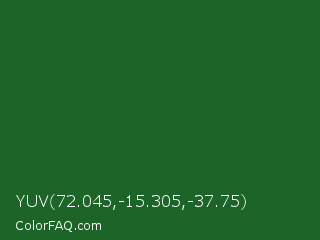 YUV 72.045,-15.305,-37.75 Color is a dark green color and the nearest color is Mughal Green #306030. Hex code #1d6429 and RGB value is rgb(29,100,41). In RGB color space, this color is composed of 11% red, 39% green, 16% blue, In CMYK color space, this color is composed of 71% cyan, 0% magenta, 59% yellow , 61% black , In HSL color space, this color has a hue angle of 130° , 55% saturation and 25% lightness.