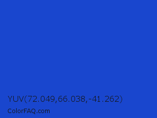 YUV 72.049,66.038,-41.262 Color is a normal blue color and the nearest color is New Car #214fc6. Hex code #1946ce and RGB value is rgb(25,70,206). In RGB color space, this color is composed of 10% red, 27% green, 81% blue, In CMYK color space, this color is composed of 88% cyan, 66% magenta, 0% yellow , 19% black , In HSL color space, this color has a hue angle of 225° , 78% saturation and 45% lightness.