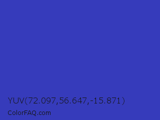 YUV 72.097,56.647,-15.871 Color is a normal blue color and the nearest color is Governor Bay #2f3cb3. Hex code #363bbb and RGB value is rgb(54,59,187). In RGB color space, this color is composed of 21% red, 23% green, 73% blue, In CMYK color space, this color is composed of 71% cyan, 68% magenta, 0% yellow , 27% black , In HSL color space, this color has a hue angle of 238° , 55% saturation and 47% lightness.