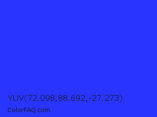 YUV 72.098,88.692,-27.273 Color is a normal blue color and the nearest color is Palatinate Blue #273be2. Hex code #2935fc and RGB value is rgb(41,53,252). In RGB color space, this color is composed of 16% red, 21% green, 99% blue, In CMYK color space, this color is composed of 84% cyan, 79% magenta, 0% yellow , 1% black , In HSL color space, this color has a hue angle of 237° , 97% saturation and 57% lightness.
