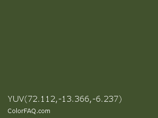 YUV 72.112,-13.366,-6.237 Color is a dark green color and the nearest color is Rifle Green #444c38. Hex code #41512d and RGB value is rgb(65,81,45). In RGB color space, this color is composed of 25% red, 32% green, 18% blue, In CMYK color space, this color is composed of 20% cyan, 0% magenta, 44% yellow , 68% black , In HSL color space, this color has a hue angle of 87° , 29% saturation and 25% lightness.