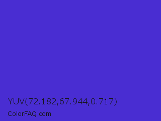 YUV 72.182,67.944,0.717 Color is a normal indigo color and the nearest color is Purple Heart Crayola #652dc1. Hex code #492dd2 and RGB value is rgb(73,45,210). In RGB color space, this color is composed of 29% red, 18% green, 82% blue, In CMYK color space, this color is composed of 65% cyan, 79% magenta, 0% yellow , 18% black , In HSL color space, this color has a hue angle of 250° , 65% saturation and 50% lightness.