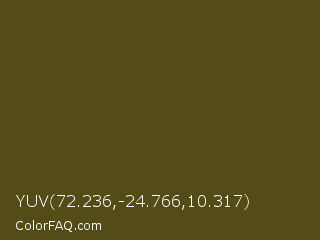 YUV 72.236,-24.766,10.317 Color is a very dark yellow color and the nearest color is Horses Neck #604913. Hex code #544c16 and RGB value is rgb(84,76,22). In RGB color space, this color is composed of 33% red, 30% green, 9% blue, In CMYK color space, this color is composed of 0% cyan, 10% magenta, 74% yellow , 67% black , In HSL color space, this color has a hue angle of 52° , 58% saturation and 21% lightness.