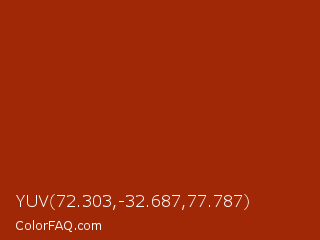 YUV 72.303,-32.687,77.787 Color is a normal red color and the nearest color is Tabasco #a02712. Hex code #a12806 and RGB value is rgb(161,40,6). In RGB color space, this color is composed of 63% red, 16% green, 2% blue, In CMYK color space, this color is composed of 0% cyan, 75% magenta, 96% yellow , 37% black , In HSL color space, this color has a hue angle of 13° , 93% saturation and 33% lightness.