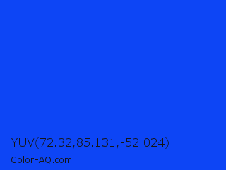 YUV 72.32,85.131,-52.024 Color is a normal blue color and the nearest color is Blue RYB #0247fe. Hex code #0d45f5 and RGB value is rgb(13,69,245). In RGB color space, this color is composed of 5% red, 27% green, 96% blue, In CMYK color space, this color is composed of 95% cyan, 72% magenta, 0% yellow , 4% black , In HSL color space, this color has a hue angle of 226° , 92% saturation and 51% lightness.