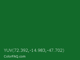 YUV 72.392,-14.983,-47.702 Color is a dark green color and the nearest color is La Salle Green #087830. Hex code #126a2a and RGB value is rgb(18,106,42). In RGB color space, this color is composed of 7% red, 42% green, 16% blue, In CMYK color space, this color is composed of 83% cyan, 0% magenta, 60% yellow , 58% black , In HSL color space, this color has a hue angle of 136° , 71% saturation and 24% lightness.