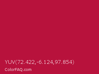 YUV 72.422,-6.124,97.854 Color is a normal red color and the nearest color is Shiraz #b20931. Hex code #b8123c and RGB value is rgb(184,18,60). In RGB color space, this color is composed of 72% red, 7% green, 24% blue, In CMYK color space, this color is composed of 0% cyan, 90% magenta, 67% yellow , 28% black , In HSL color space, this color has a hue angle of 345° , 82% saturation and 40% lightness.