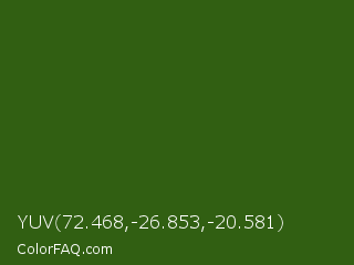YUV 72.468,-26.853,-20.581 Color is a very dark green color and the nearest color is Dell #396413. Hex code #315f12 and RGB value is rgb(49,95,18). In RGB color space, this color is composed of 19% red, 37% green, 7% blue, In CMYK color space, this color is composed of 48% cyan, 0% magenta, 81% yellow , 63% black , In HSL color space, this color has a hue angle of 96° , 68% saturation and 22% lightness.