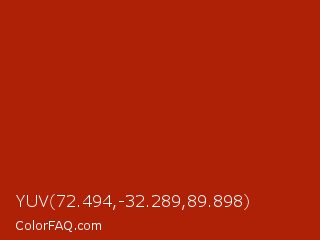 YUV 72.494,-32.289,89.898 Color is a normal red color and the nearest color is Rufous #a81c07. Hex code #af2107 and RGB value is rgb(175,33,7). In RGB color space, this color is composed of 69% red, 13% green, 3% blue, In CMYK color space, this color is composed of 0% cyan, 81% magenta, 96% yellow , 31% black , In HSL color space, this color has a hue angle of 9° , 92% saturation and 36% lightness.
