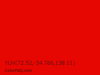 YUV 72.52,-34.766,138.11 Color is a normal red color and the nearest color is KU Crimson #e8000d. Hex code #e60602 and RGB value is rgb(230,6,2). In RGB color space, this color is composed of 90% red, 2% green, 1% blue, In CMYK color space, this color is composed of 0% cyan, 97% magenta, 99% yellow , 10% black , In HSL color space, this color has a hue angle of 1° , 98% saturation and 45% lightness.