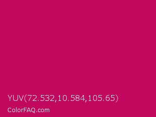 YUV 72.532,10.584,105.65 Color is a normal rose color and the nearest color is Pictorial Carmine #c30b4e. Hex code #c1075e and RGB value is rgb(193,7,94). In RGB color space, this color is composed of 76% red, 3% green, 37% blue, In CMYK color space, this color is composed of 0% cyan, 96% magenta, 51% yellow , 24% black , In HSL color space, this color has a hue angle of 332° , 93% saturation and 39% lightness.