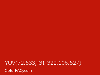 YUV 72.533,-31.322,106.527 Color is a normal red color and the nearest color is International Orange Engineering #ba160c. Hex code #c21709 and RGB value is rgb(194,23,9). In RGB color space, this color is composed of 76% red, 9% green, 4% blue, In CMYK color space, this color is composed of 0% cyan, 88% magenta, 95% yellow , 24% black , In HSL color space, this color has a hue angle of 5° , 91% saturation and 40% lightness.