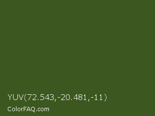 YUV 72.543,-20.481,-11 Color is a dark green color and the nearest color is Army Green #4b5320. Hex code #3c571f and RGB value is rgb(60,87,31). In RGB color space, this color is composed of 24% red, 34% green, 12% blue, In CMYK color space, this color is composed of 31% cyan, 0% magenta, 64% yellow , 66% black , In HSL color space, this color has a hue angle of 89° , 47% saturation and 23% lightness.