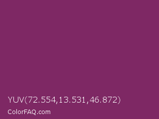 YUV 72.554,13.531,46.872 Color is a normal magenta color and the nearest color is Boysenberry #873260. Hex code #7e2864 and RGB value is rgb(126,40,100). In RGB color space, this color is composed of 49% red, 16% green, 39% blue, In CMYK color space, this color is composed of 0% cyan, 68% magenta, 21% yellow , 51% black , In HSL color space, this color has a hue angle of 318° , 52% saturation and 33% lightness.