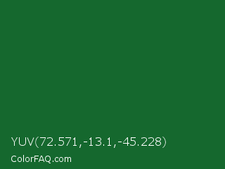 YUV 72.571,-13.1,-45.228 Color is a dark green color and the nearest color is Jewel #126b40. Hex code #15682e and RGB value is rgb(21,104,46). In RGB color space, this color is composed of 8% red, 41% green, 18% blue, In CMYK color space, this color is composed of 80% cyan, 0% magenta, 56% yellow , 59% black , In HSL color space, this color has a hue angle of 138° , 66% saturation and 25% lightness.