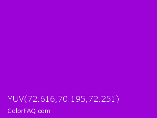 YUV 72.616,70.195,72.251 Color is a normal purple color and the nearest color is Dark Violet #9400d3. Hex code #9b03d7 and RGB value is rgb(155,3,215). In RGB color space, this color is composed of 61% red, 1% green, 84% blue, In CMYK color space, this color is composed of 28% cyan, 99% magenta, 0% yellow , 16% black , In HSL color space, this color has a hue angle of 283° , 97% saturation and 43% lightness.